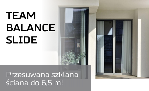 Przesuwne drzwi tarasowe Team Balance Slide posiadają tak niskie ramy ościeżnic i skrzydeł, że wyglądają jak duże tafle szkła niemal bez profili. Im większe okna, tym jaśniej we wnętrzach – Team Balance Slide umożliwia zestawienie ze sobą czterech skrzydeł przesuwnych o szerokości konstrukcji nawet do 6,5 m i wysokości 2,7 m.